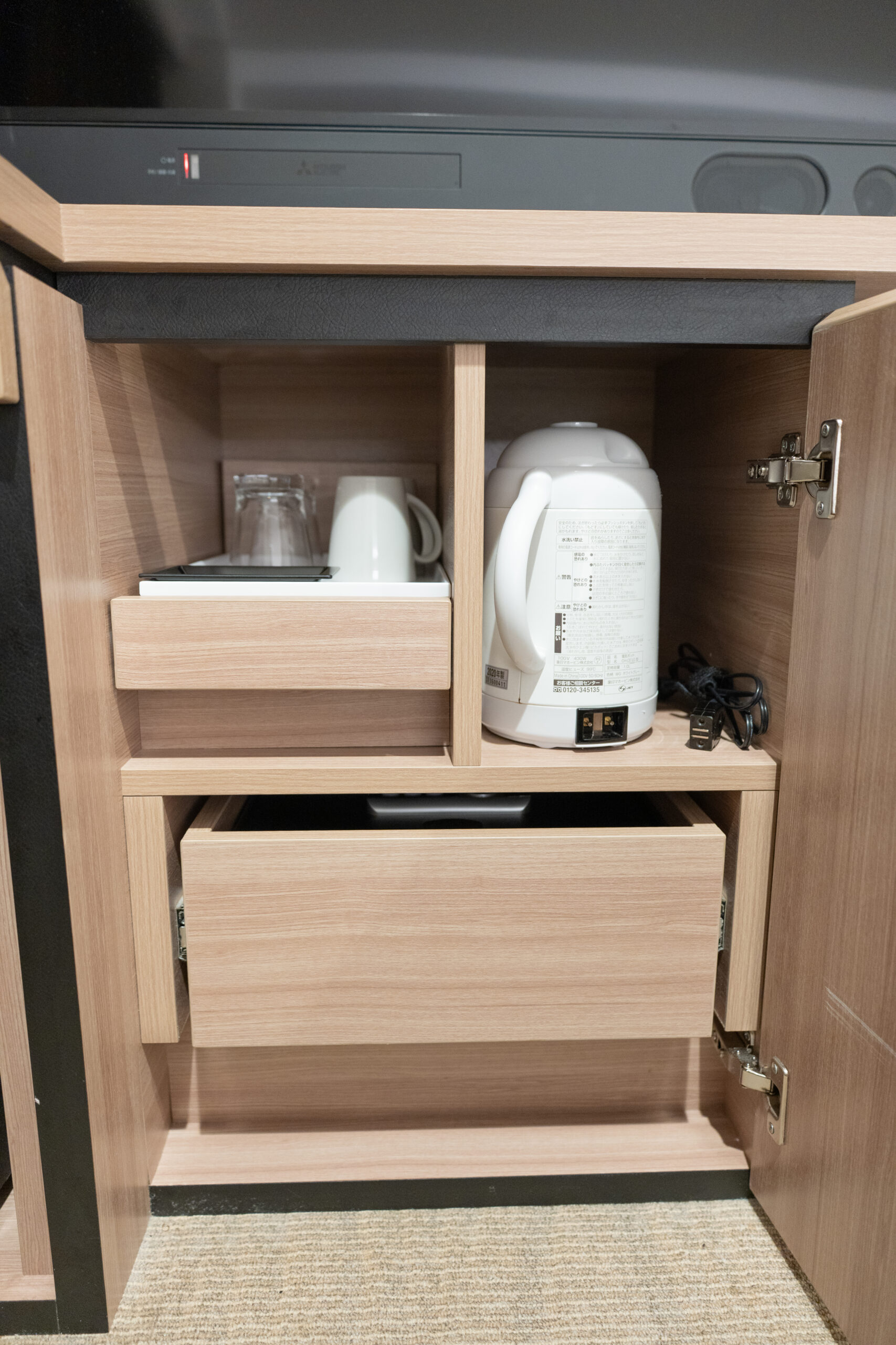 冷蔵庫やポット、マグカップ等はテレビ台に集約されていました。