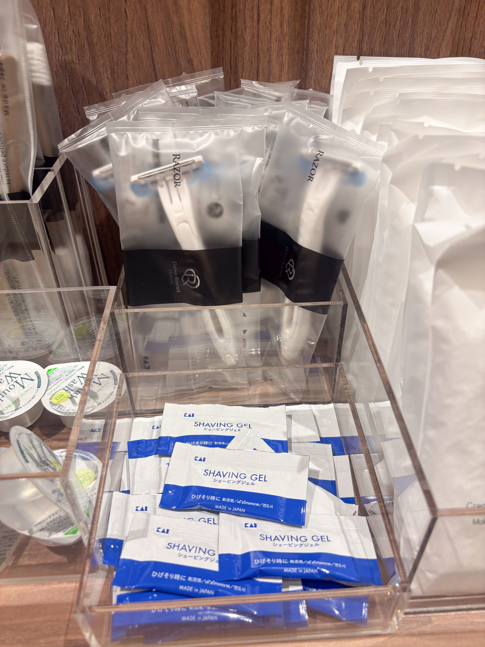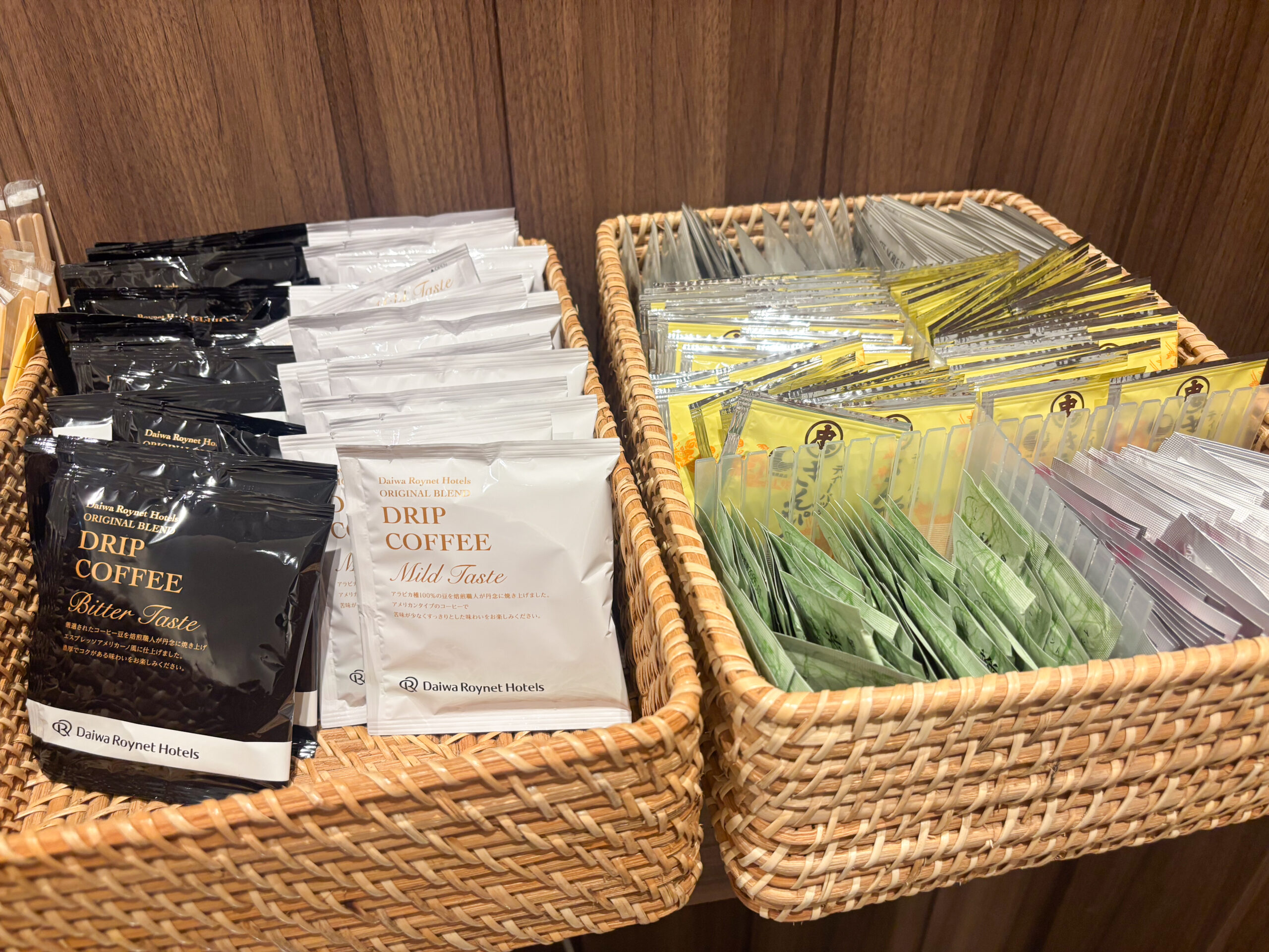 歯ブラシやマウスウォッシュ、櫛、シャワーキャップ、綿棒、カミソリ、ボディタオル、コーヒーとお茶等、全国チェーンのホテルということもありよくあるラインナップです。